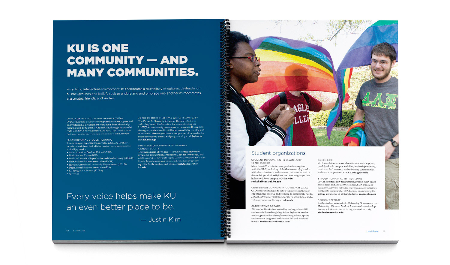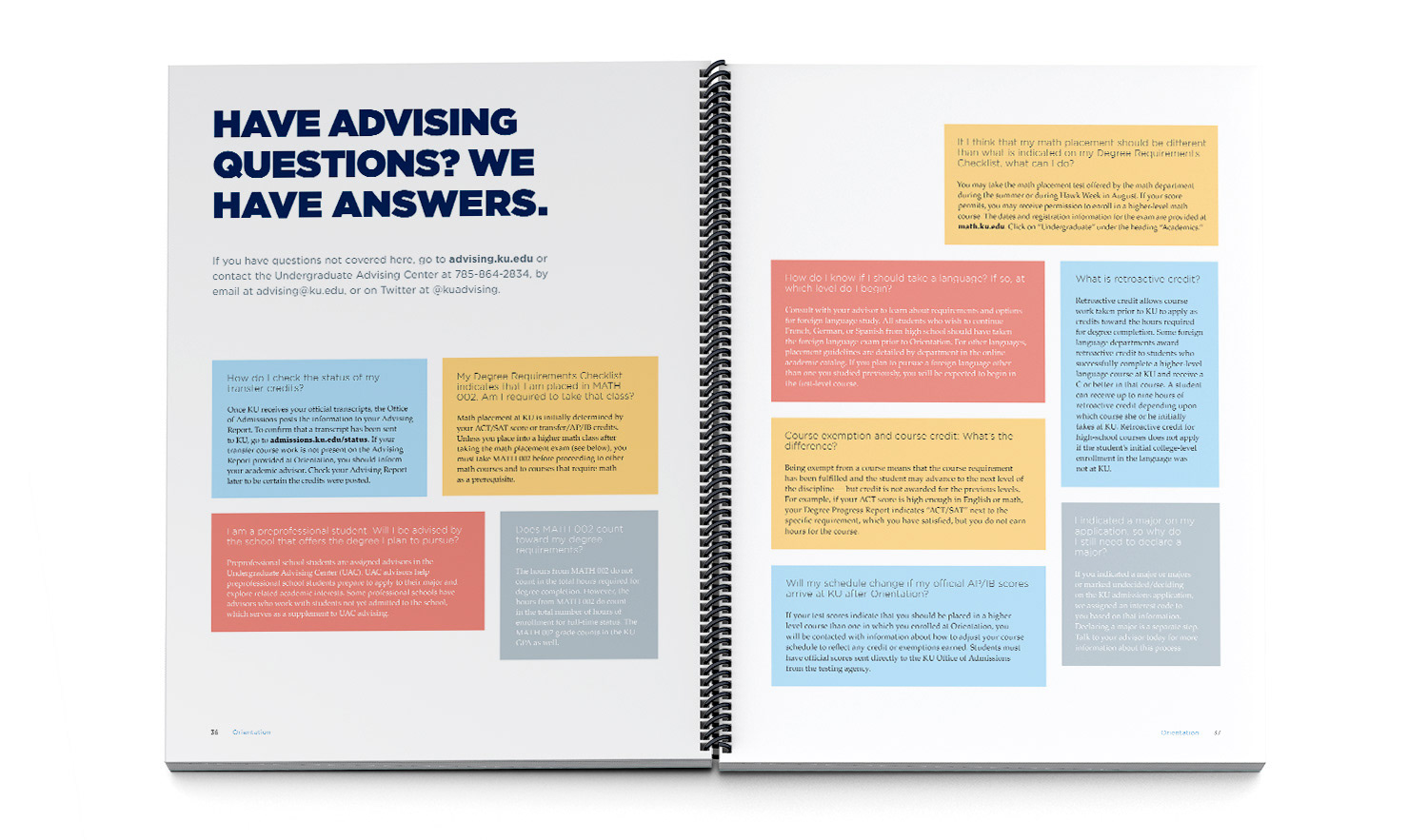 While I was an Art Director with the KU Marketing Communications department the KU Office of First-year Experience approached us with the desire to update their Orientation Guide, a book handed out to new students during Orientation visits. The goal was to create something students would actually be able to absorb and hopefully hang on to for future reference. To achieve this, we wanted to make the guide much more visual and user-friendly than previous years.